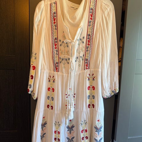 Elegant og feminin Hale Bob-kjole, ubrukt og i perfekt stand. Kjolen har flatterande V-hals, markert midje og lett utsvinga skjørt. Det fargerike blomster- og bordmønsteret gjev eit eksklusivt og tidlaust uttrykk.