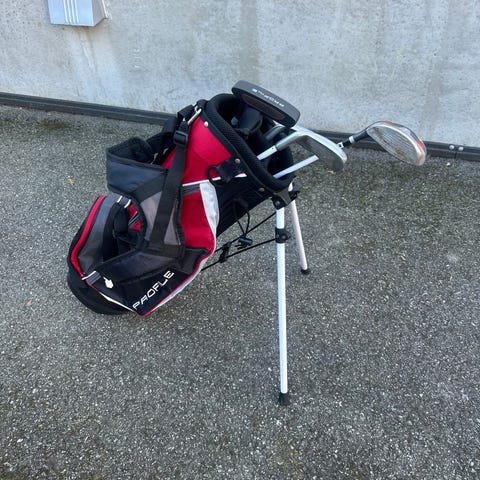 Golfsett som inkluderer en golfbag og et sett med golfkøller. Settet består av flere køller med ulik funksjon, samt en putter. Bagen er svart med røde detaljer og har flere lommer for oppbevaring. Passer for golfspillere som ønsker et komplett sett med utstyr.