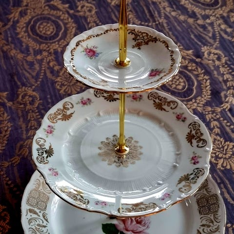 Selvlaget etasjefat av fint eldre porselen fra Tyskland, England og Norge selges for kr 450,-. For detaljer og mål se bilder.
