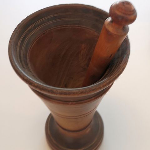 Dette er en morter og pistill i tre, dekorert med inskripsjoner og et blomstermotiv. Trollhättan