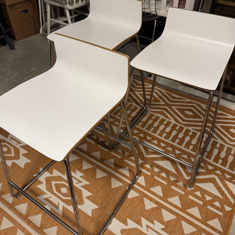IKEA barkrakker med sete i hvit plast og ben i krommetall. Designet for bruk ved kjøkkenøy eller barbord. Moderne og enkel stil som passer i ulike interiør. Selges for 200,- pr stk.