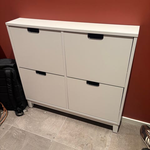 Selger to pent brukte Hemnes skoskap fra IKEA i hvit utførelse. Dette er den praktiske modellen som både har to store rom for sko og en hendig skuff øverst til nøkler, reflekser eller andre småting.