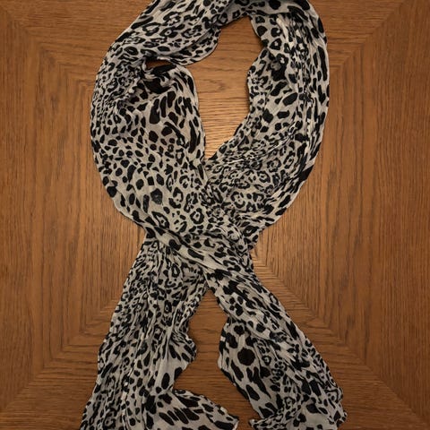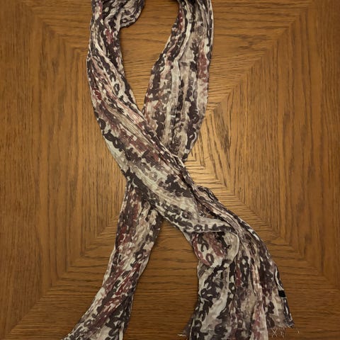 Mykt og varmt skjerf av ukjent merke og materiale selges. Det er ikke synlig brukt.