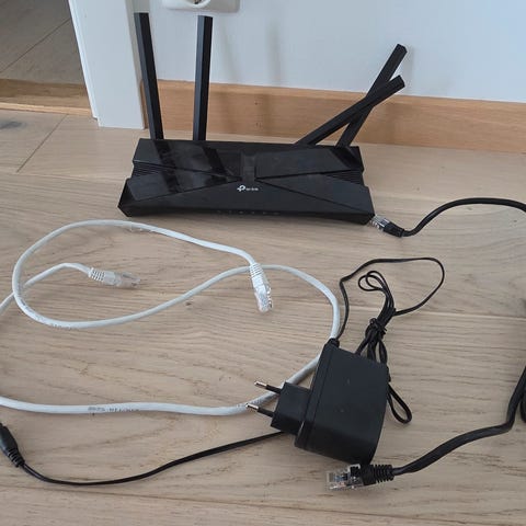 Jeg selger en TP-Link Archer AX1500 WiFi 6-router sammen med en Cat6 nettverkskabel (5 meter, sort). Passer bra for stabilt hjemmenett, gaming og streaming, med god dekning og rask tilkobling.