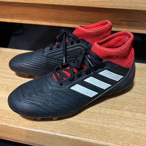 Adidas Predator fotballsko i svart og rød farge, størrelse 38. Skoene har knotter under sålen for bruk på gressbaner. Materialet er syntetisk, og skoene er designet for fotballspillere.