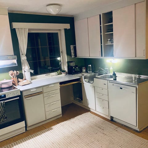 Kjøkkeninnredning i heltre eik med overskap og underskap fra 2002 oppsatt i L- form. Inneholder integrert oppvaskmaskin, stekeovn, og kokeplate. Farge i naturlig eik med glassdetaljer i et av overskapene.