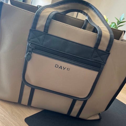 DAY ET tote veske. Vesken er laget av lin og bomull og har et enkelt design med sort og beige fargekombinasjon. Den har håndtak for bæring og en liten lomme på utsiden. Innvendig er det en mindre lomme med glidelås for oppbevaring av mindre gjenstander.