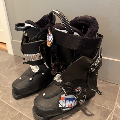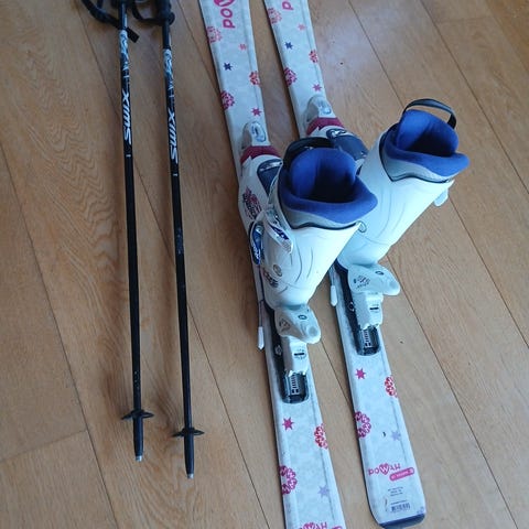 Ski 130 cm, stavar 90 cm, sko ca str 37 (23,0-23,5). Bruksmerker, men i god stand.