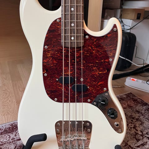 Lettspilt P-bass m/ øvingsforsterker, reim og kabel klar til bruk. Bassen er lett og er fin for nybegynnere og mer erfarne som er ute etter en bass som ikke veier så mye. Forsterkeren er på 10watt.