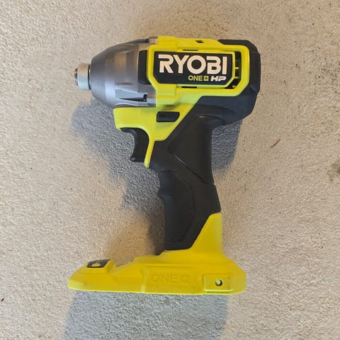 Ryobi ONE+ HP spikerpistol med 18V batteri. Verktøyet er designet for spikring og har et ergonomisk grep for bedre kontroll. Passer til bruk med kompatible 18V batterier fra Ryobi ONE+ serien.