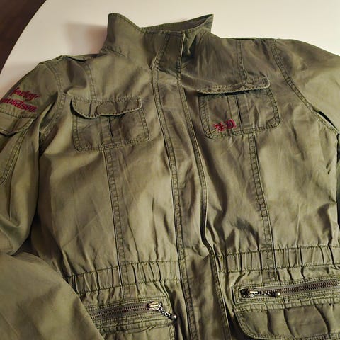 Harley-Davidson Kjøre jakke i størrelse L for kvinner. Jakken er svart og laget av polyester. Den har dekorative striper på armene og logoer på både front og rygg.