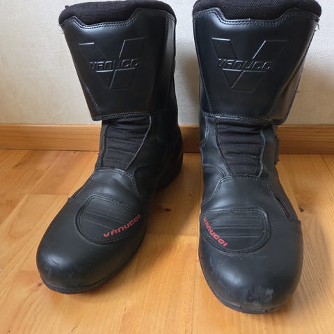 NO FEAR støvel i størrelse 10, omtrent Euro 43/44 og trøye / bokse Beskyttelsesvest i størrelse XL, svart farge, med justerbare stropper og polstring for beskyttelse ved motorsykkelbruk eller lignende aktiviteter.