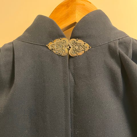 Halvlang cape (ca. 100cm) i kongeblå ulldamask og foret med svart ullstoff. Capet er pent og lite brukt. Sølvhekte (nypusset) i halsen.