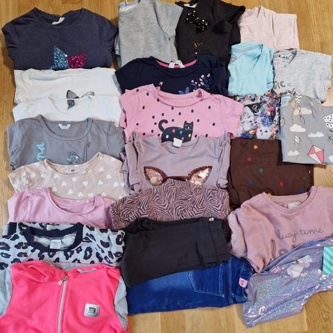 Inneholder masse pent brukt tøy. Hovedsakelig i størrelse 122/128. Noe i str 134. Alt er pent brukt av ett barn. Noen av klærne er aldri brukt og noe er fåtall ganger.