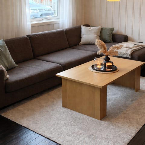 God og romslig sofa med plass til mange. Bordet er 110x110 og 42 cm høgt. En liten skade i ene hjørne (se bilde)