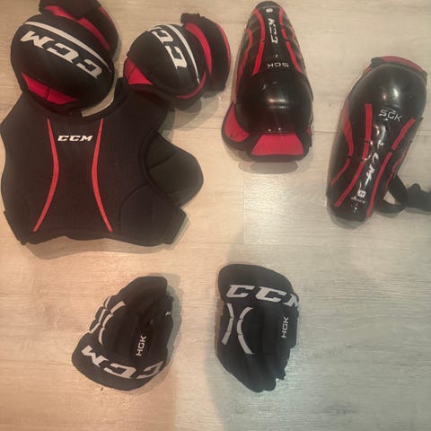CCM Ishockeybeskyttelse sett i størrelse YT L/G. Settet inkluderer beskyttelse for overkropp, albuer, hofter og knær, susp og hals. Passer for ishockeyspillere og gir beskyttelse under trening og kamp.