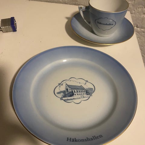 Slotts-servise fra Bing & Grøndahl selges. 6 stk asjetter, Ø: 17 cm. 7 stk kopp og skål. Kopp på 16 cl og er 6,4 cm høy. Koppeskål, Ø: 14 cm. + en ekstra koppeskål, så totalt 8 skåler.