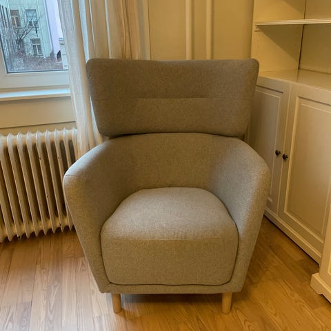 Selger en pent brukt IKEA Vedbo lenestol med høy rygg i fargen Gunnared mørk grå. Nypris er 2995,-