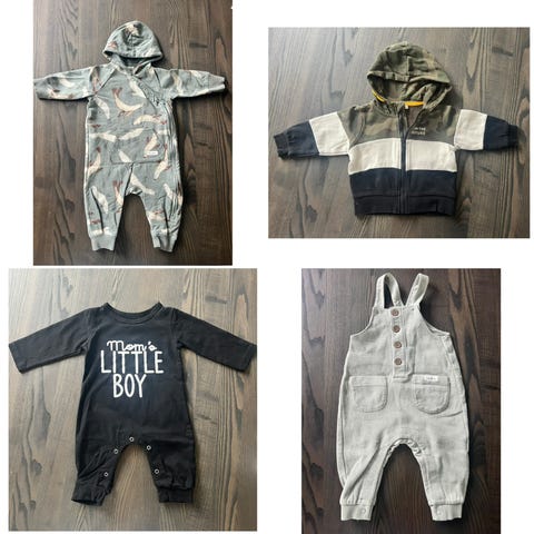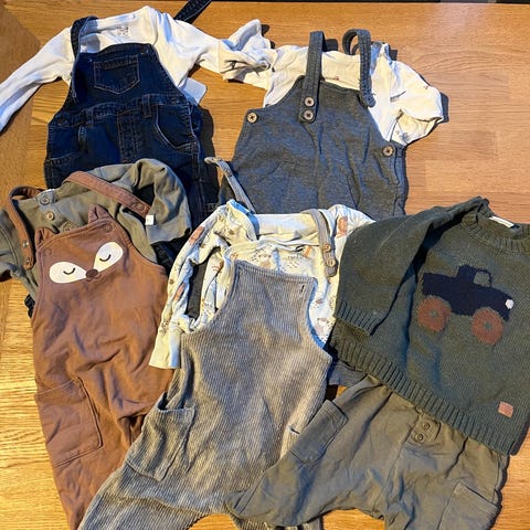 Noen av plaggene er merket med størrelse 74 eller 80, men de er små i størrelsen og passer barn fra 68 cm. Noen klær har små flekker på seg.