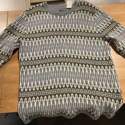 Fjällräven ullgenser i størrelse XL for herre. Genseren er laget av 100% ull. Den har et mønster i flere farger og er designet for å gi varme og komfort.