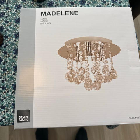 Selger en helt ny og ubrukt taklampe av typen DONAU plafond fra Scan Lamps. Lampen har et elegant og moderne design med dekorative krystaller som gir et eksklusivt uttrykk og fint lysspill.
