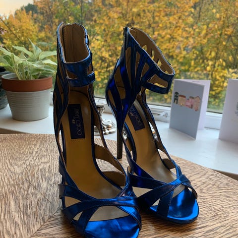 Balenciaga hæler i blå farge, størrelse 39. Hælene har åpen tå og ankelstropp, med høy hæl. Egnet for bruk ved anledninger som krever formell eller stilfull fottøy. Trenger en tur til skomaker, selges derfor billig. Heel høyden er 10cm