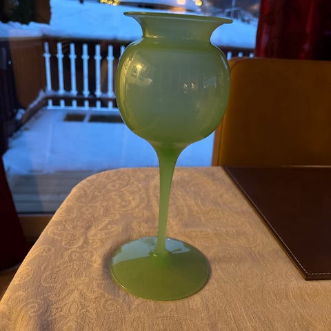 Hadeland Glassverk vase laget av klart glass. Vasen har et dekorativt gravert mønster med motiv av en båt med fiskere.
