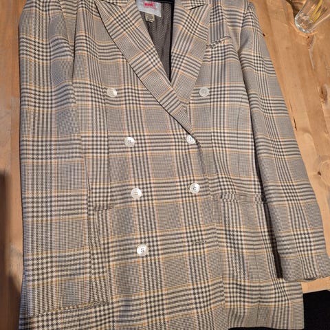 Mondi flerfarget blazer (liten str 40) og sort skjørt i fløyel for dame, størrelse 38. Settet inkluderer en blazer med rutemønster i rødt, grønt og blått, og et ensfarget svart skjørt. Materialet er fløyel, og plagget er produsert i Tyskland.