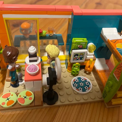 Lego Friends 41703 Trehytte er et byggesett som inkluderer en detaljert hytte i treet med flere etasjer, rutsjebane, huske og ulike tilbehør. Settet er bygget, pent lekt med.