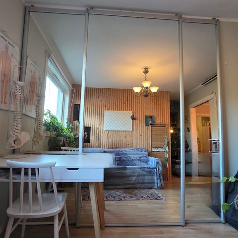 Skyvedørene og skinne er demonert, og klare for henting. Tre skyvedører som er 238 i høyden (inkl hjulene) og 108 i bredden hver. De står på skinne, som gjør at en skyvedør kan gå foran de andre og overlappe. Maksimal bredde blir da 3 x 108.