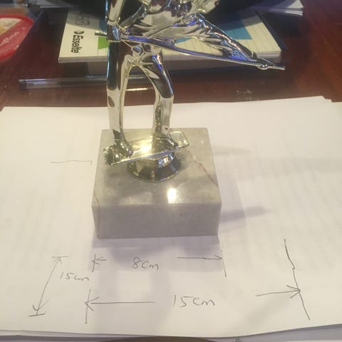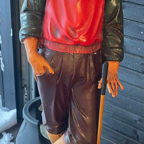 Skulptur av en golfer i metall. Figuren viser en person i golfslagposisjon og står på en firkantet base. Passer som dekorasjon for golfentusiaster eller som en generell kunstgjenstand.