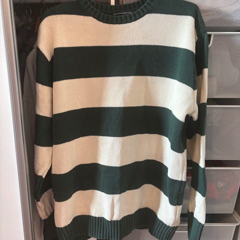 Myk og god. Strikket med v hals og ribbet på ermer og rundt halsen. Fin alene og med noe under. «one size» men passer best xs-s.