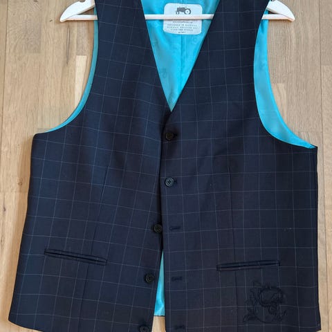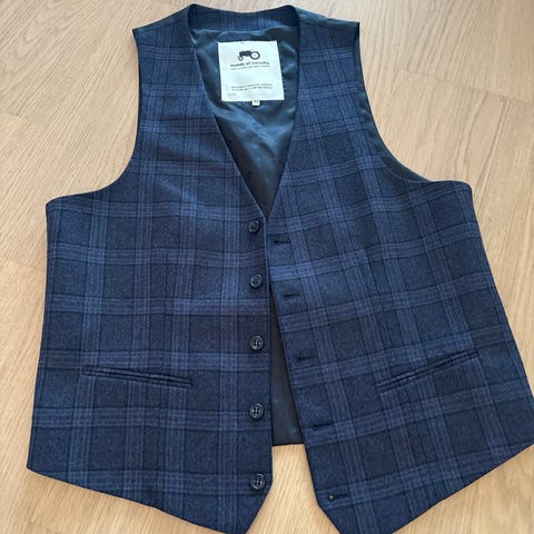 Moods of Norway vest i blå farge, laget av ullmateriale. Vesten er designet for herre og har størrelse 48. Den har knappelukking foran og foret innside.