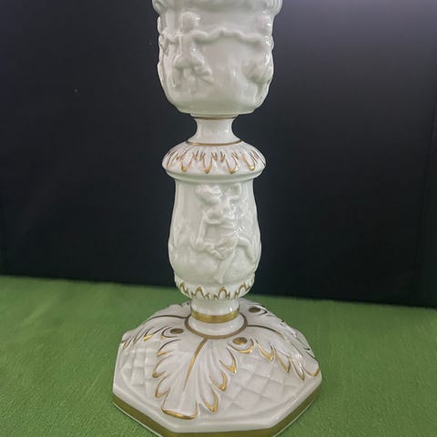 Den har et intrikat kuttet mønster på basen og et unikt, bølgende design for armene som holder lysene.