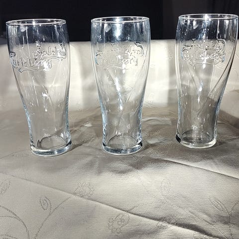 Perfekt for enhver ølentusiast eller samler! Selger et flott sett med tre originale Carlsberg-ølglass, komplett med den ikoniske kronelogoen og gullkant øverst. Disse glassene er i utmerket stand og klare til å nytes.
