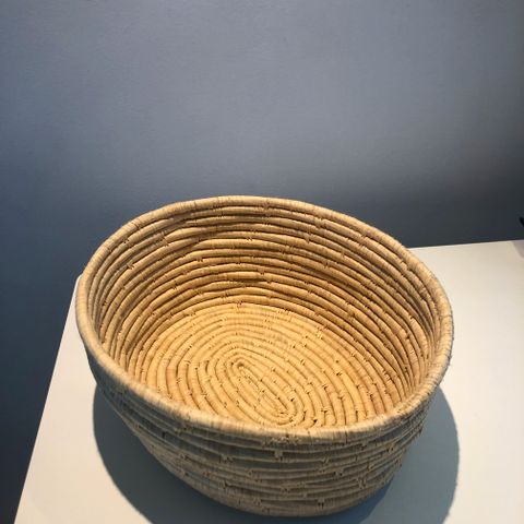 Handlaget kurv med lokk laget av flettet materiale. Kurven har en rund form med håndtak på sidene, og lokket har en knapp for enkel åpning. Egnet for oppbevaring av ulike gjenstander. F.eks klær. Selges for en sum på 450kr. (eller høystbydende). https://butikk.houseofprana.no/product/savannenkurv-medium-skittentoyskurv-afrikansk-kurv-gronn/