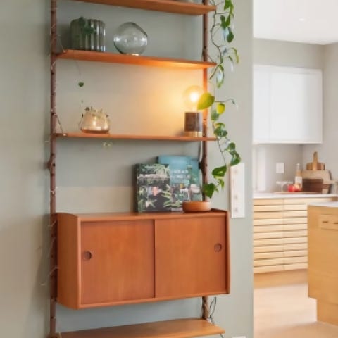 String reol og vitrine produsert av String. Reolen har tre hyller og en skapdel nederst med glassdører. Følger også med en magasinhylle.