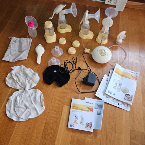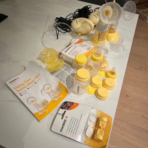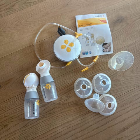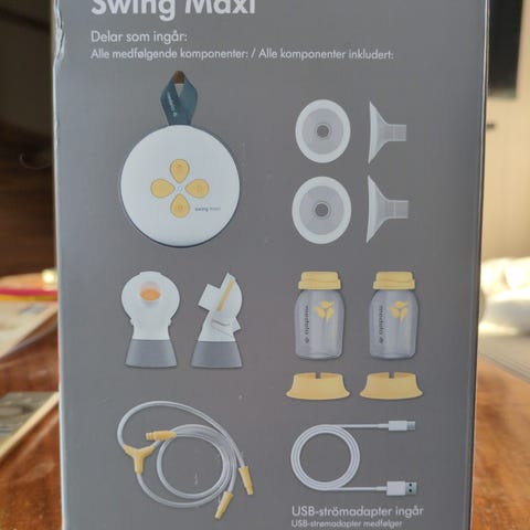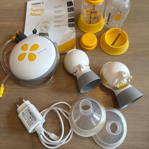 Medela Swing Maxi brystpumpe sett inkludert pumpeenhet, flasker, brysttrakter, slanger, og annet tilbehør. Utstyrt for dobbel pumping, laget av plastmaterialer, og designet for å hjelpe med melkepumping. Samlet for 500kr.