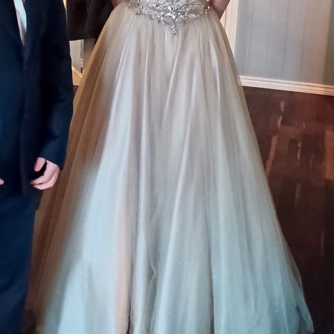 Nydelig Champagne farget Ballkjole selges! Den er i størrelse S men passer XS-M pga snøringen i ryggen. Bare brukt 2 ganger . Kjøpt på Finn i år.