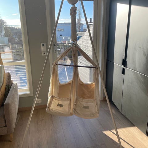 Inkluderer tvillingvugge, stativ, motor 2.0, 2 myke madrasser og 2 avstiverbunner samt Fjær + for mer tyngde. (20kg)