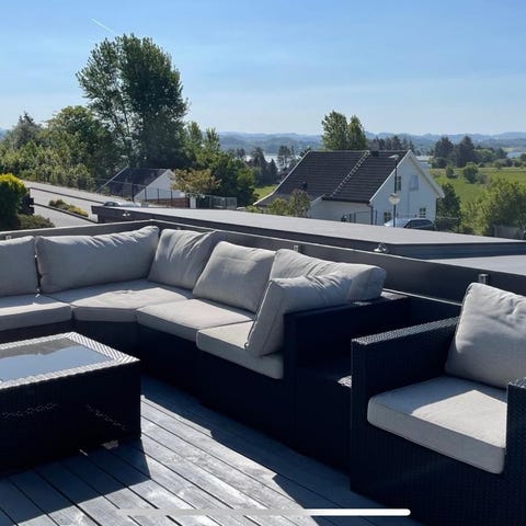 Hjørnesofa i rotting med vannavstøtende puter og glassbord