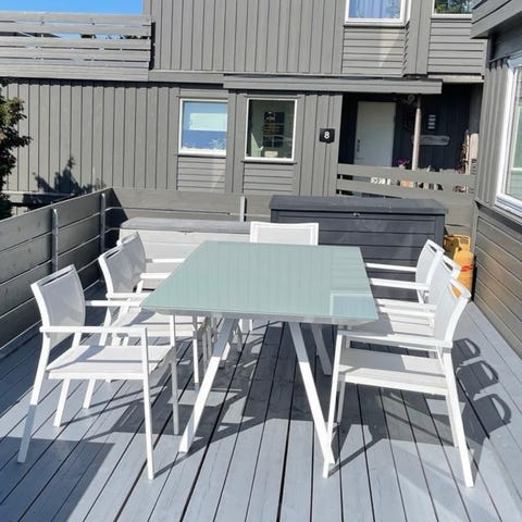 I fin stand. Putene er oppbevart inne. Flekker kan forekomme, men det er lett å vaske av flekker av stoffet. Rottingen og bordet har stått ute.