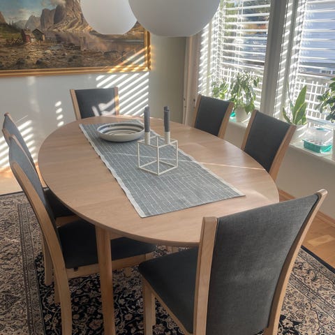Mater Dining table, er et spisebord med skarp profil og tidløs design. Bordplaten er laget i FSC sertifiserad bøk med ben i svartlakkert stål. Et svært solid bord. Har noen småskader, men mindre sjenerende enn bildene skulle tilsi.