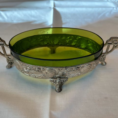 Art Nouveau Jardiniere, opphøyde roser, konfektskål, i sølvplett og inngravert glass, den er 25x16 cm, høyde 7 cm