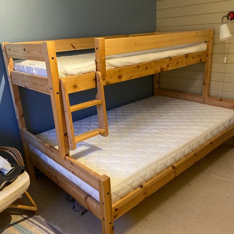 Heltre køyeseng i hvitmalt furu selges med madrasser. 2stk laken kan følge med om ønskelig.