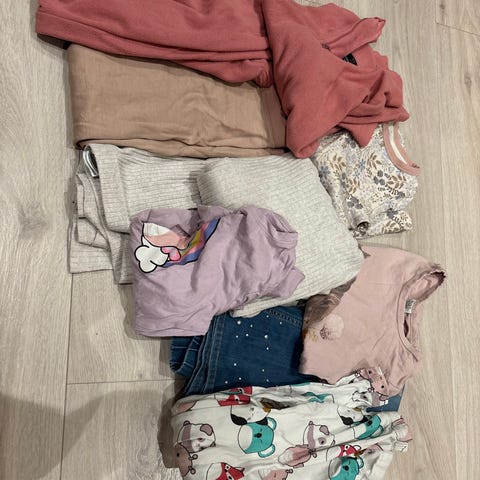 Pakken består av ei dongrijakke, en cardigan, to kjoler, ei ulltrøye, fire gensere, ei bukse og ei t-skjorte.