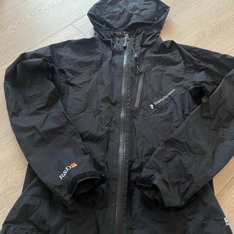 Peak Performance Regntøy i Gore-Tex materiale, flerfarget, størrelse L for kvinner. Jakken er laget for å gi beskyttelse mot regn og fuktighet, egnet for utendørs bruk under våte forhold.