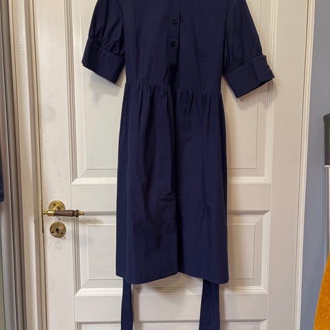 Lite brukt skjørt i blå cordfløyel str M. Belte og kort splitt bak, lengde under kneet.