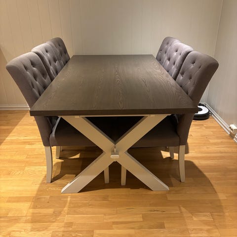 Spise gruppe med 6 stoler. Bordet er IKEA Eikedalen som er 180 cm med mulighet til å forlenge slik at det blir 240 cm.