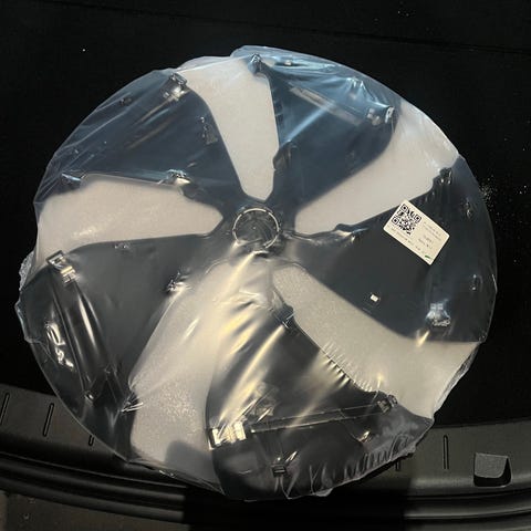 Selger et komplett sett med 4 stk originale Tesla Crossflow aero felgkapsler (hjulkapsler/felgdeksler) til Model Y Juniper (2025/2026-modeller).